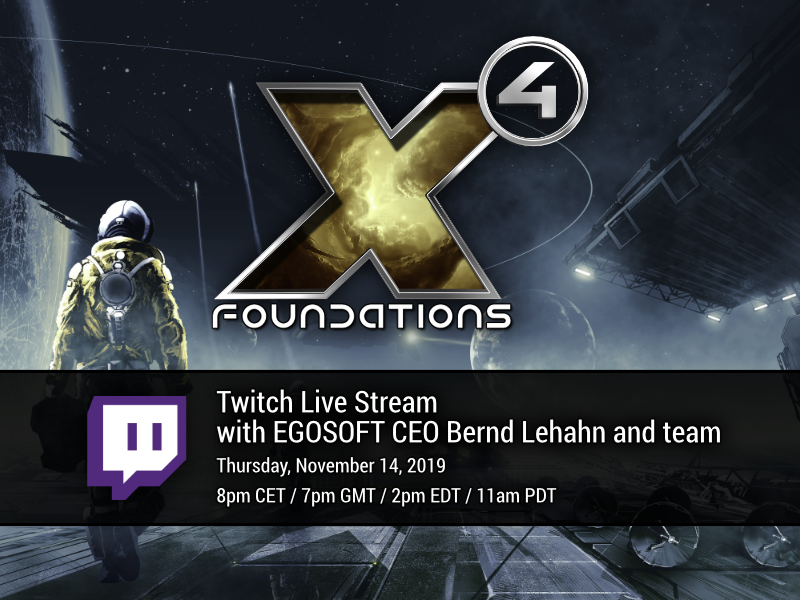 Twitch-Kanal (ab 20:00 Uhr MEZ) und nehmt teil an einem Live-Stream über die aktuelle und zukünftige Entwicklung von X4: Foundations!