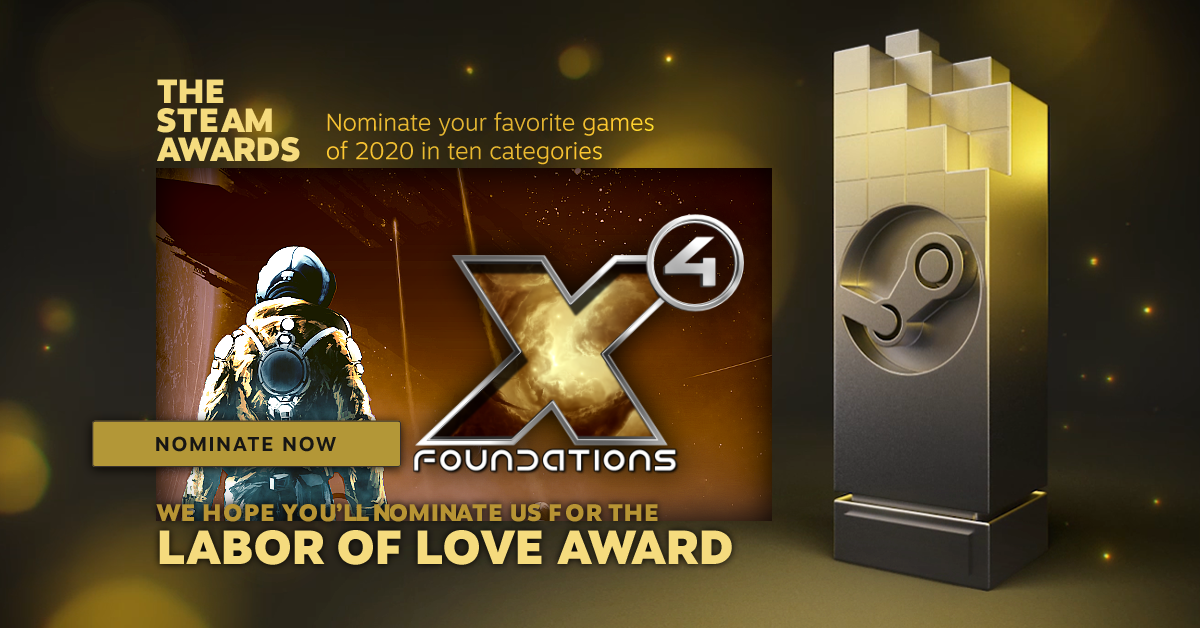 Wir wären euch unendlich dankbar, wenn ihr uns für den diesjährigen Steam Werk der Liebe-Award in Betracht zieht. Ihr könnt uns entweder direkt hier in dieser Steam-News, auf der X4: Foundations Store-Seite oder über die Steam Awards-Seite nominieren.