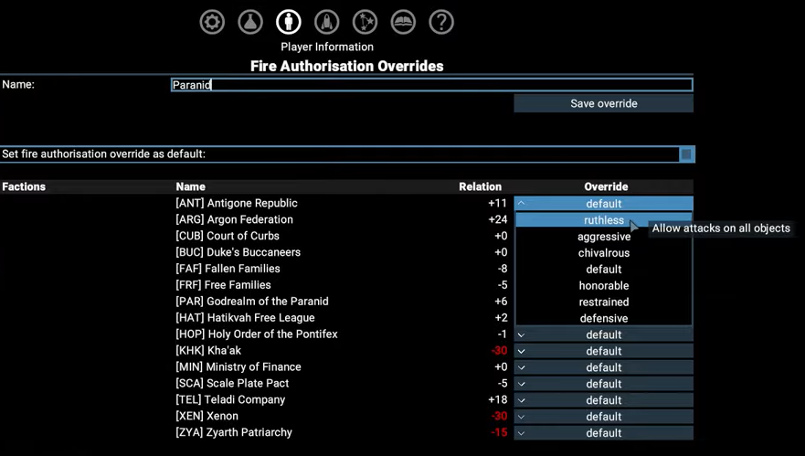 mittelfristigen Angriff könnt ihr eine neue Einstellung "Feuerberechtigungsüberschreibung" anwenden, entweder global oder auf bestimmte Schiffe. Damit wird diesen Schiffen mitgeteilt, welche Fraktionen sie angreifen dürfen - unabhängig davon, ob diese Fraktionen tatsächlich Feinde sind oder nicht. Diese Option kann verwendet werden, um einen allgemeinen Kampf mit einer bestimmten Fraktion zu beginnen, indem das übliche friedliche Verhalten eurer Schiffe gegenüber der Fraktion außer Kraft gesetzt wird. Sie kann auch verwendet werden, um zu versuchen, Frieden mit einer Fraktion zu schließen, die derzeit euer Feind ist. Dies wird erreicht, indem das Standardverhalten eurer Schiffe, das normalerweise ein Angriff wäre, mit einer Überschreibungsanweisung, nicht zu schießen, geändert wird.